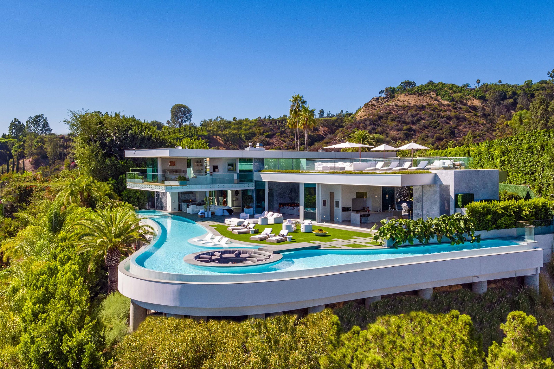 Un ponte galleggiante permette l’ingresso nel living composto da salotti con camini e sale da pranzo di varie grandezze. Le pareti di vetro dal pavimento al soffitto offrono viste esplosive da Century City a Catalina.