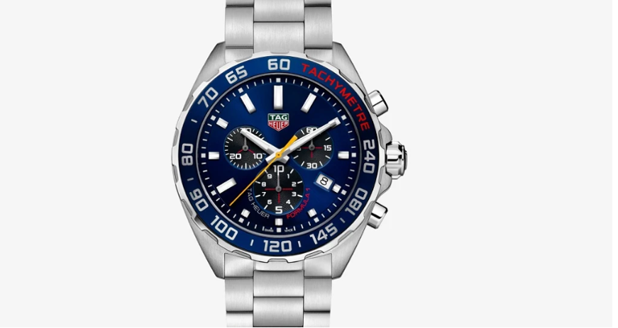 Il tag Heuer in acciaio è blu come la macchina da corsa con accenti rossi e gialli. Ha un datario sul segno delle 4 e la custodia posteriore è incisa con il logo Aston Martin Red Bull Racing. È anche al quarzo e viene fornito con un bracciale in acciaio.